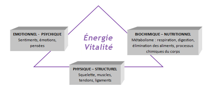 Ces 3 aspects sont les piliers sur lesquels repose notre santé. Ils sont interdépendants : une perturbation qui en affecte un se répercute immédiatement sur les 2 autres.
